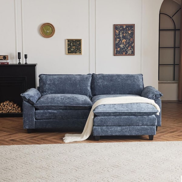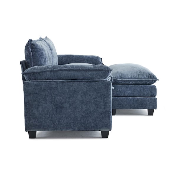 KD 85 in. Wide Pillow Top Arm Chenille L-shaped Sofa in Blue with Ottoman