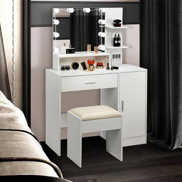 White Makeup Vanity Set With Adjustable LED Lighting, Cushloned Stool, And Spaclous Storage