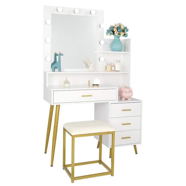 White Makeup Vanity Set with 9 LED Bulbs, Cushloned Stool, 3 Storage Shelves and 4 Drawers