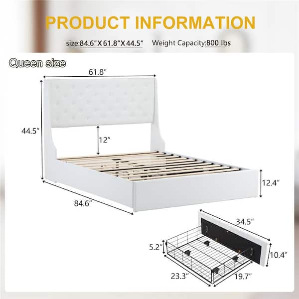 White Upholstered Metal Frame Queen Size Platform Bed with 4 Drawers, Wingback Headboard with Button Tufted Design