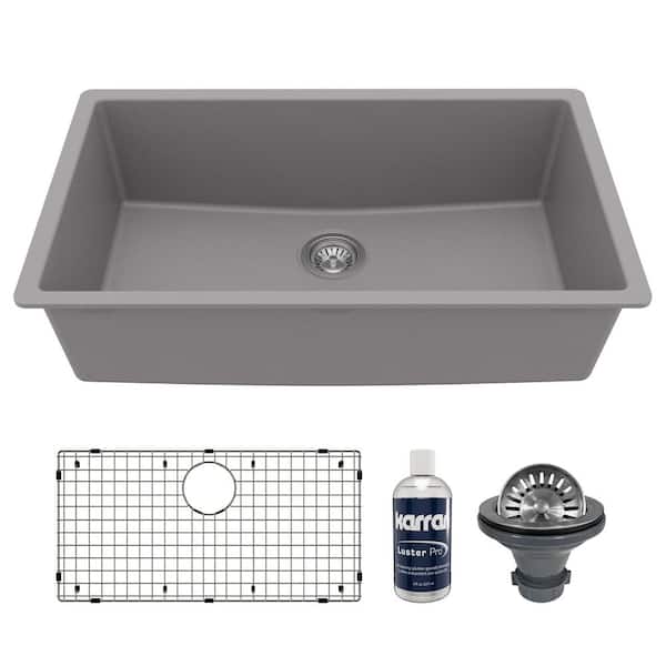 32.5 in. Large Single Bowl Undermount Kitchen Sink in Grey with Bottom Grid and Strainer