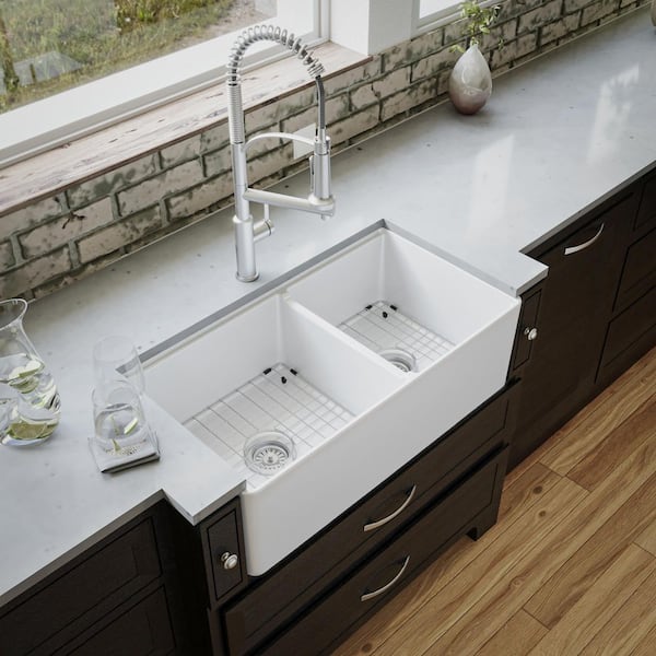 Fireclay 33 in. Farmhouse/Apron-Front Double Bowl White Gloss Fireclay Workstation Kitchen Sink with Reversible Front
