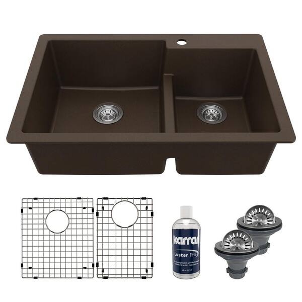 QT-811 Quartz/Granite 33 in. Double Bowl 60/40 Top Mount Drop-in Kitchen Sink in Brown with Bottom Grid and Strainer