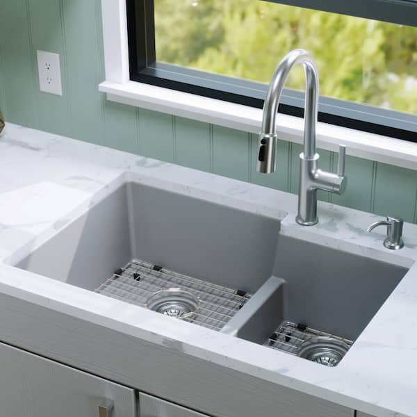 QU-811 Quartz/Granite 32 in. Double Bowl 60/40 Undermount Kitchen Sink in Grey with Bottom Grid and Strainer