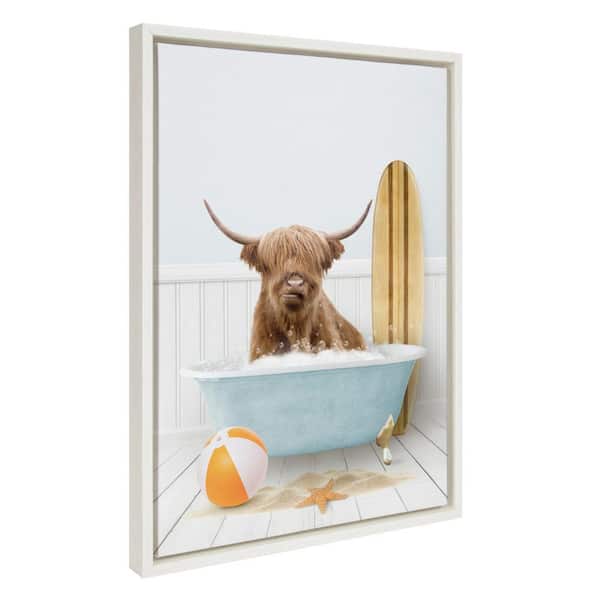 Sylvie Highland Cow Beach House Bath with Surfboard by Amy Peterson White Framed Art Print 18 in. x 24 in.