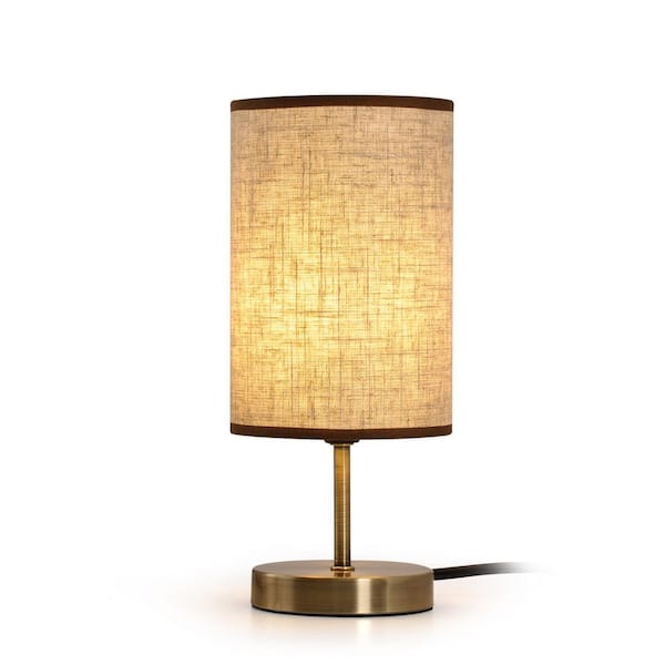 12 in. Antique Brass Small Table Lamp with Beige Round Linen Lampshade for Bedside, Living Room