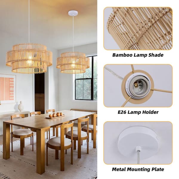 Solara 16 in. 2-Tiers 1-Light White Pendant Light with Natural Bamboo Round Shadeand No Bulbs Included