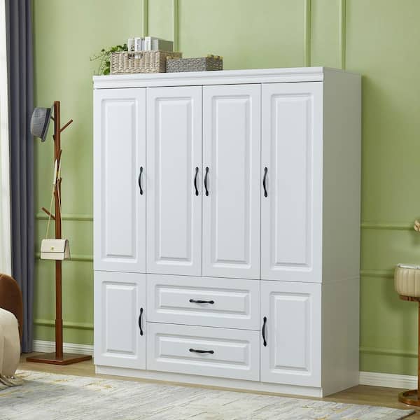 White Wooden 74 in. H x 63 in. W x 20 in. D Bedroom Armoire Wardrobe Closet 4-Door Hanging Rod, Drawers, Storage Shelves