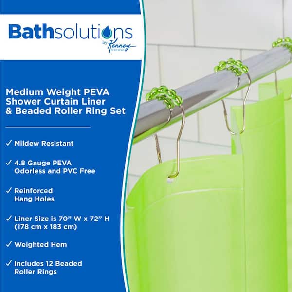 70 in. W x 72 in. H Medium Weight PEVA Shower Curtain Liner and Beaded Roller Ring Set in Green