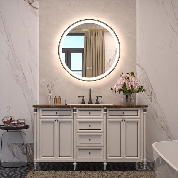 24 in. W x 24 in. H Round Aluminum Framed LED Light with 3-Color and Anti-Fog Wall Mount Bathroom Vanity Mirror in Black