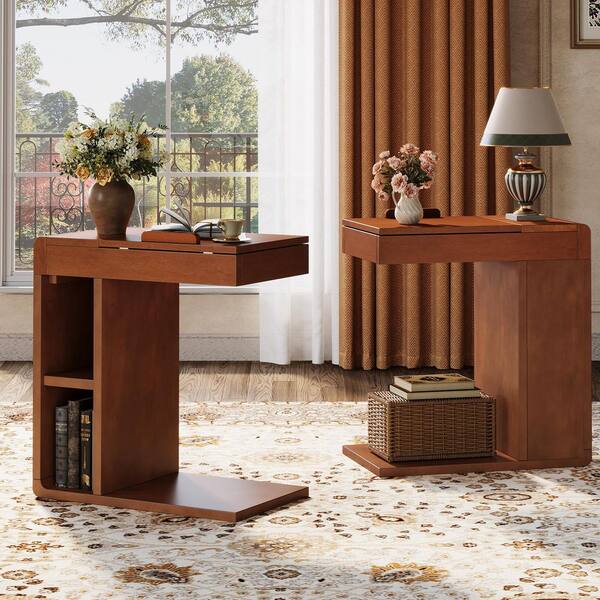 Kerlin 23.6 in. Walnut C-Shaped Wood End Table (Set of 2), Farmhouse Side Table with Adjustable Top