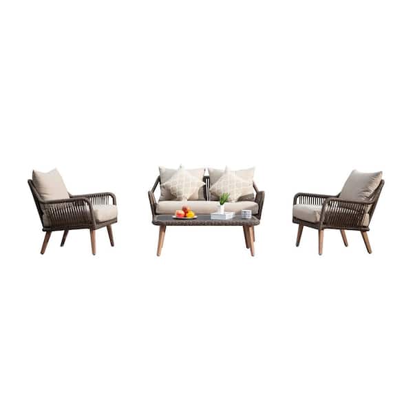 Khaki 4-Piece Metal Outdoor Sectional Set with Cushion and Coffee Table