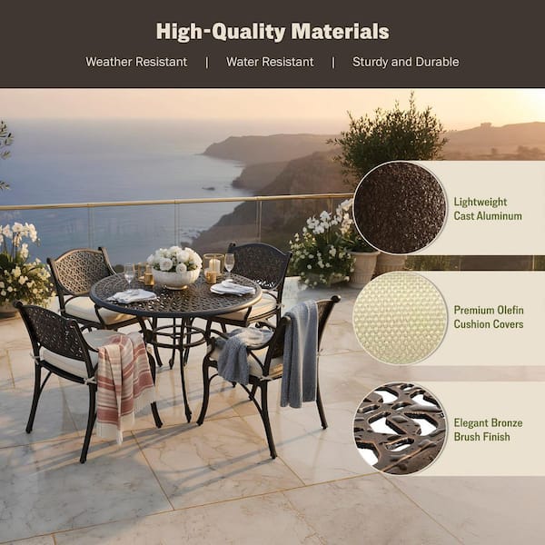 5-Piece Bronze Cast Aluminum Outdoor Dining Set for Patio with Beige Cushions