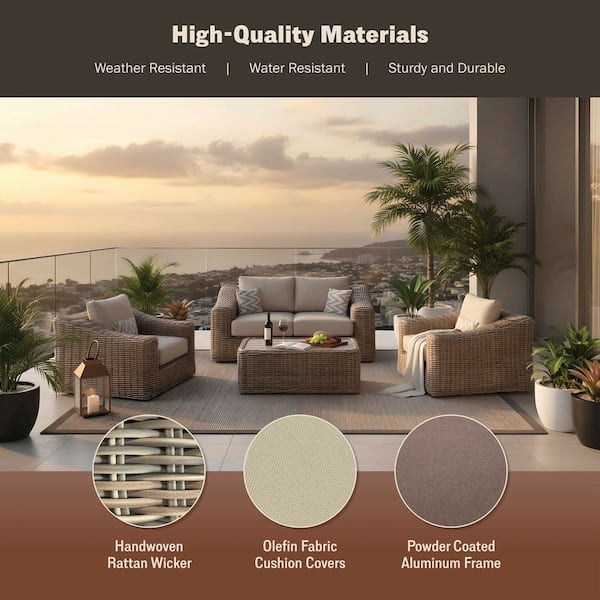 Hawaii 4-Piece Vintage Rattan Wicker Deep Seating Patio Conversation Set With Ivory Cushions