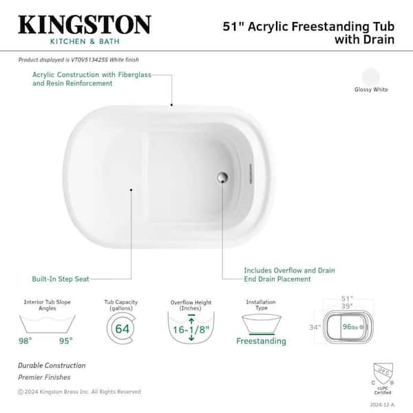 Aqua Eden 51.2 in. x 33.9 in. Acrylic Oval Flatbottom Freestanding Soaking Bathtub with Drain in Glossy White