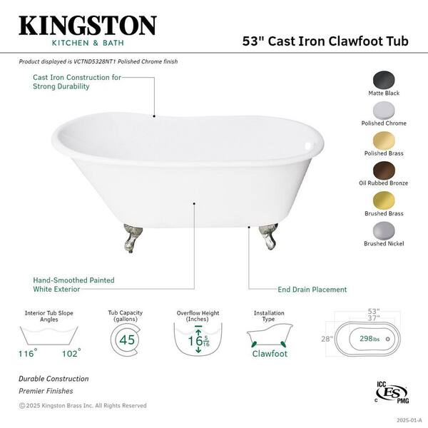 Aqua Eden 53 in. x 27.9 in. Cast Iron Oval Clawfoot Soaking Bathtub in White/Polished Brass