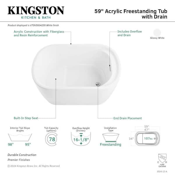 Aqua Eden 59.1 in. x 33.9 in. Acrylic Oval Flatbottom Freestanding Soaking Bathtub with Drain in Glossy White