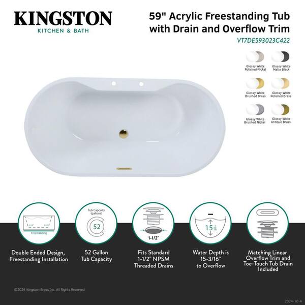 Aqua Eden 59 in. x 29.3 in. Acrylic Flatbottom Soaking Freestanding Bathtub in Glossy White/Brushed Nickel with Drain