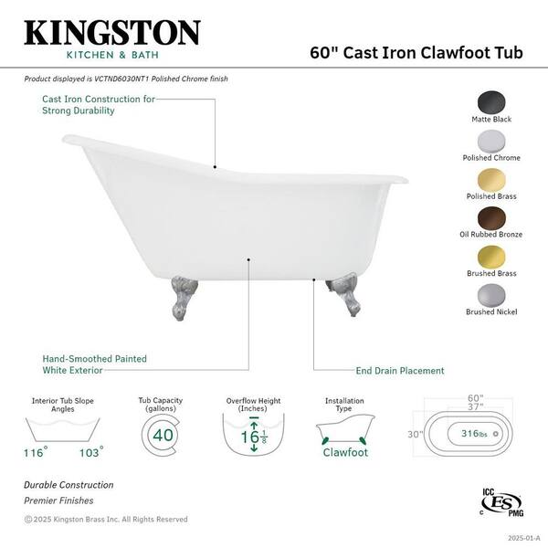 Aqua Eden 60.3 in. x 30.3 in. Cast Iron Oval Clawfoot Soaking Bathtub in White/Polished Brass