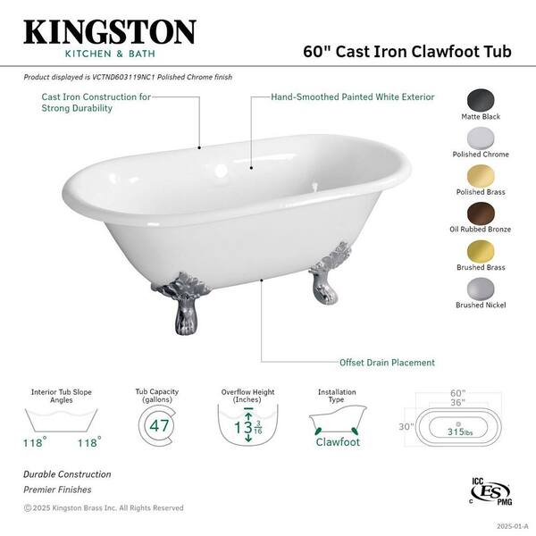 Aqua Eden 60 in. x 30.3 in. Cast Iron Oval Clawfoot Soaking Bathtub in White/Polished Brass