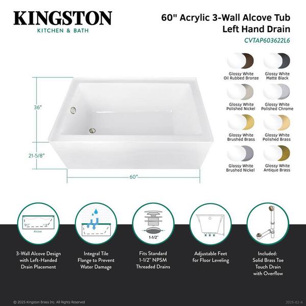 Aqua Eden 60 in. x 36 in. Acrylic Rectangular Alcove Soaking Bathtub with Left Drain in Glossy White/Polished Chrome