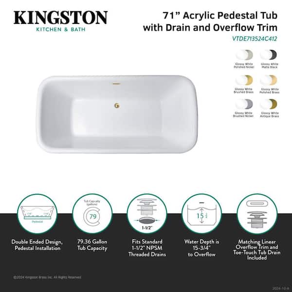 • Freestanding 71 in. x 29.1 in bathtub with predrilled drain