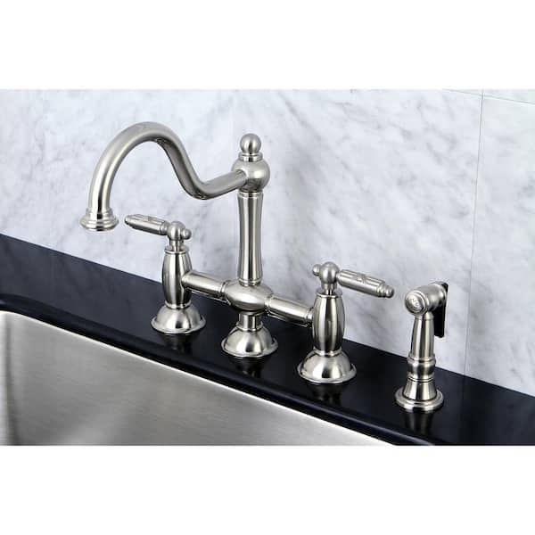 Restoration 2-Handle Bridge Kitchen Faucet with Brass Sprayer in Brushed Nickel