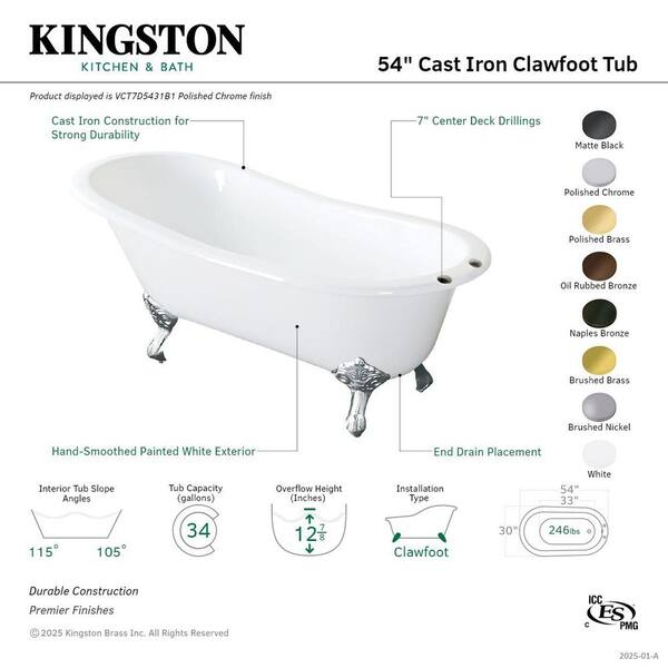 Tazatina 53.9 in. x 30.3 in. Cast Iron Oval Clawfoot Soaking Bathtub in White/Brushed Brass