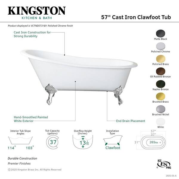 Tazatina 56.9 in. x 30.5 in. Cast Iron Oval Clawfoot Soaking Bathtub in White/Brushed Brass