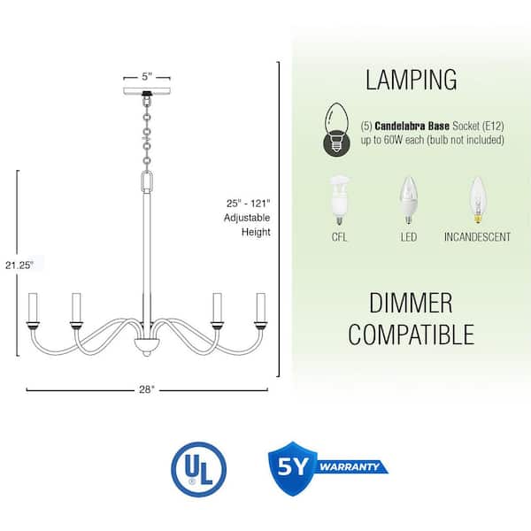 • Uses (5) 60W Type B E12 incandescent or LED bulbs (not included)