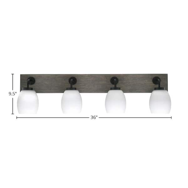 Kirby 36 in. 4 Light Black and Painted Wood-look Vanity Light with 5 in. White Linen Glass Shades No Bulbs Included