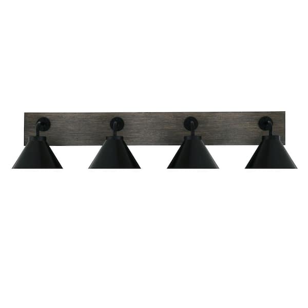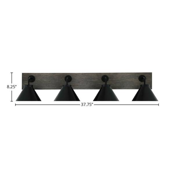 Kirby 37.75 in. 4 Light Black and Painted Wood-look Vanity Light with 7 in. Matte Black Metal Shades No Bulbs Included