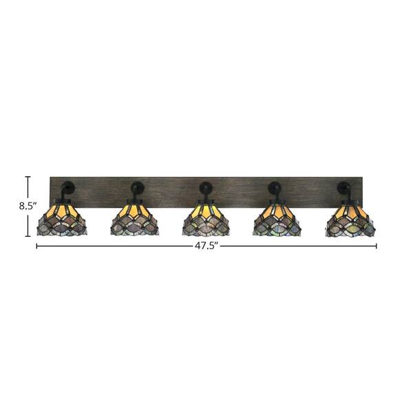 Kirby 47.5 in. 5 Light Black and Painted Distressed Wood-look Vanity Light with 7 in. Art Glass Shades No Bulbs Included