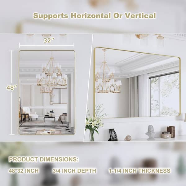 48 in. W x 32 in. H Rectangular Framed Wall Mounted Bathroom Vanity Mirror in Brushed Gold