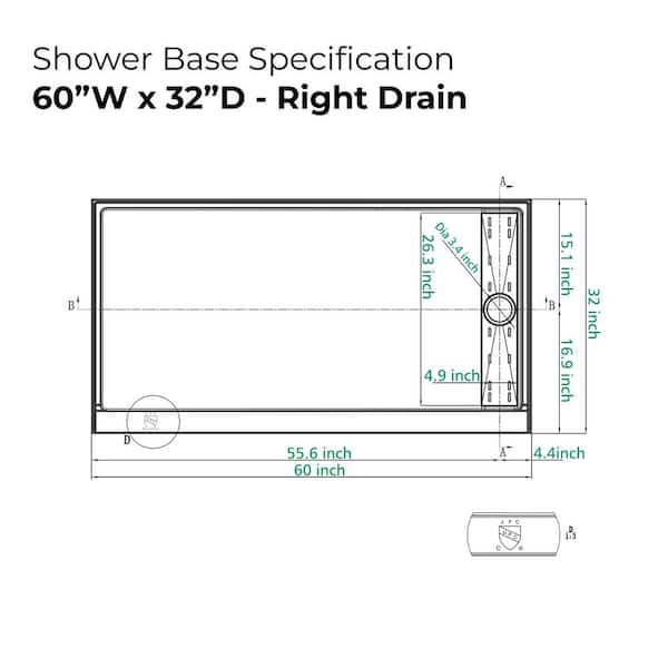 32 in. L x 60 in. W x 96 in. H 4 Pieces Alcove SMC Shower Kit with Surround and Base in Glossy White Bricks Right Drain