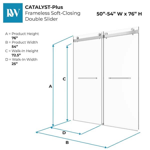 Catalyst-Plus 54 in. W x 76 in. H Sliding Frameless Shower Door in Brushed Nickel with Soft Closing and 3/8" Clear Glass