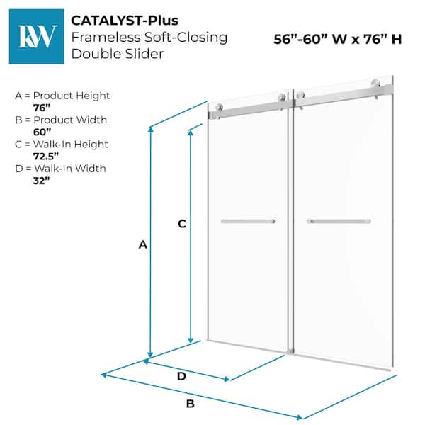 Catalyst-Plus 60 in. W x 76 in. H Sliding Frameless Shower Door in Brushed Nickel w/ Soft Closing 3/8 in. Clear Glass