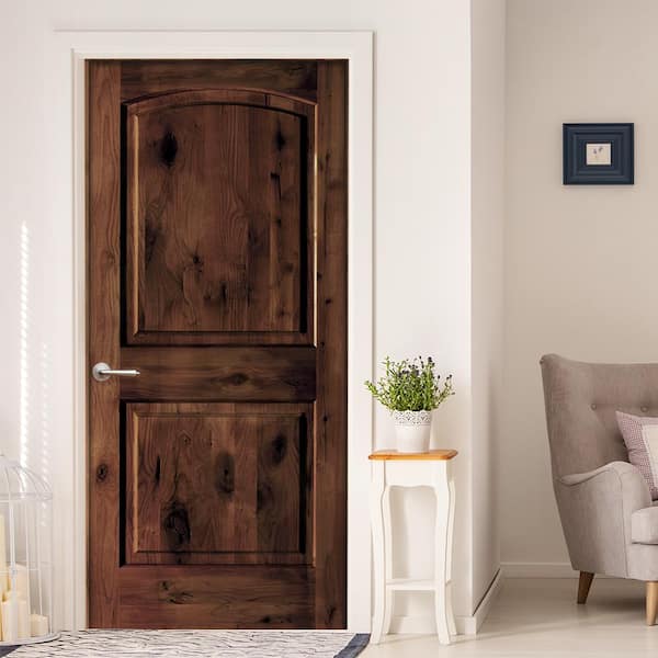 24 in. x 80 in. Knotty Alder 2-Panel Right-Handed Red Mahogany Stain Wood Single Prehung Interior Door with Arch Top