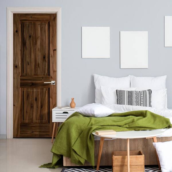 28 in. x 80 in. Knotty Alder 2 Panel Left-Hand Square Top V-Groove Red Chestnut Stain Wood Single Prehung Interior Door