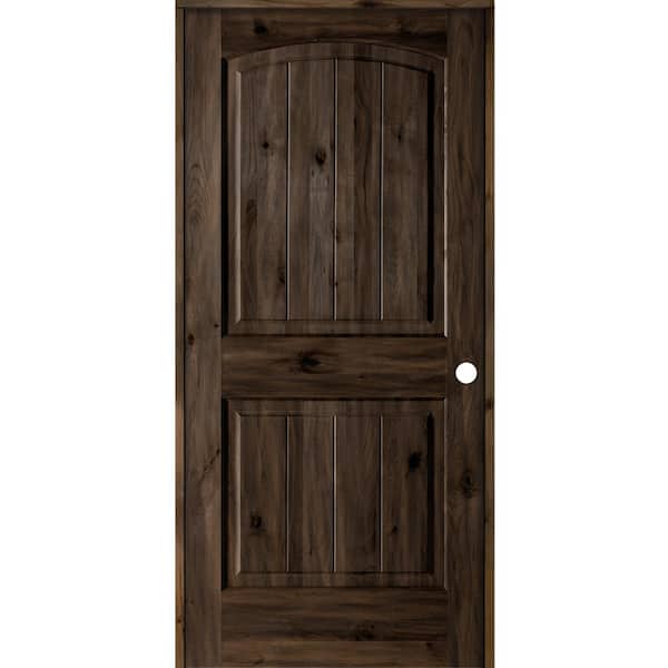 28 in. x 80 in. Knotty Alder 2 Panel Left-Hand Top Rail Arch V-Groove Black Stain Wood Single Prehung Interior Door
