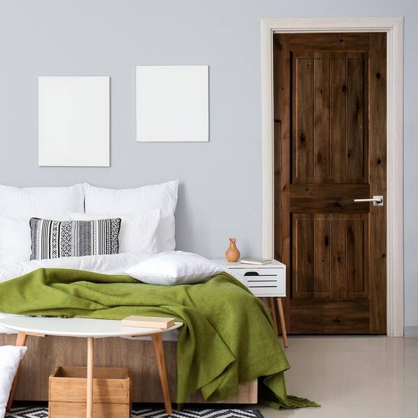 30 in. x 80 in. Knotty Alder 2 Panel Left-Hand Square Top V-Groove Red Mahogany Stain Wood Single Prehung Interior Door
