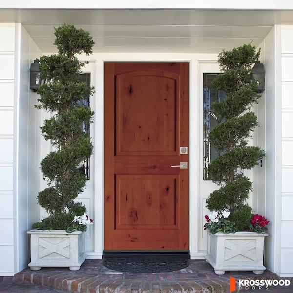 30 in. x 80 in. Rustic Knotty Alder 2-Panel Arch Top Left-Hand/Inswing BEHR Amaretto Stain Wood Prehung Front Door