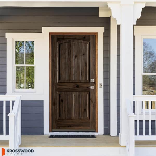 30 in. x 80 in. Rustic Knotty Alder 2 Panel Arch Top V-Groove Left-Hand/Inswing Black Stain Wood Prehung Front Door