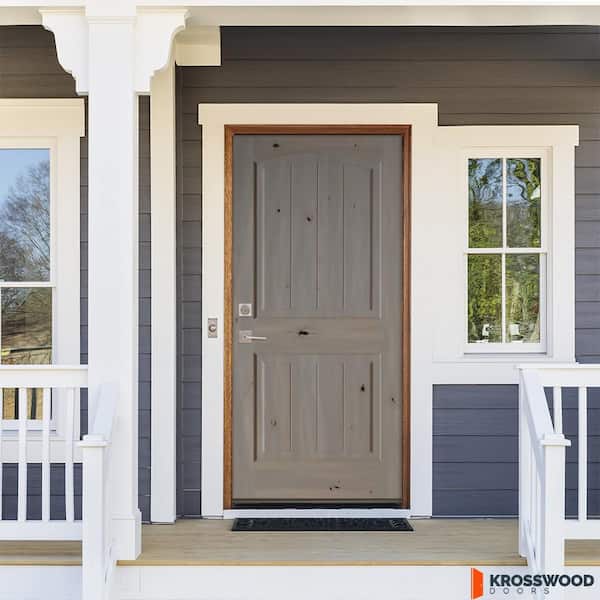 30 in. x 80 in. Rustic Knotty Alder 2 Panel Arch Top V-Groove Right-Hand/Inswing Grey Stain Wood Prehung Front Door