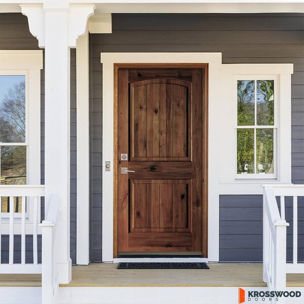 30 in. x 80 in. Rustic Knotty Alder Arch Top V-Grooved Red Mahogony Stain Right-Hand Wood Single Prehung Front Door