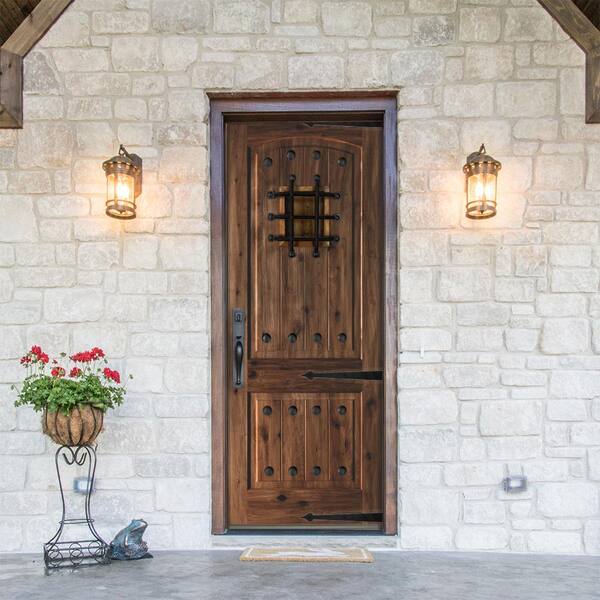 32 in. x 96 in. Mediterranean Knotty Alder Arch Top 2 Panel Right-Hand/Inswing Grey Stain Wood Prehung Front Door