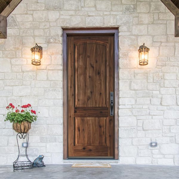 32 in. x 96 in. Rustic Knotty Alder 2 Panel Arch Top V-Groove Left-Hand/Inswing Grey Stain Wood Prehung Front Door