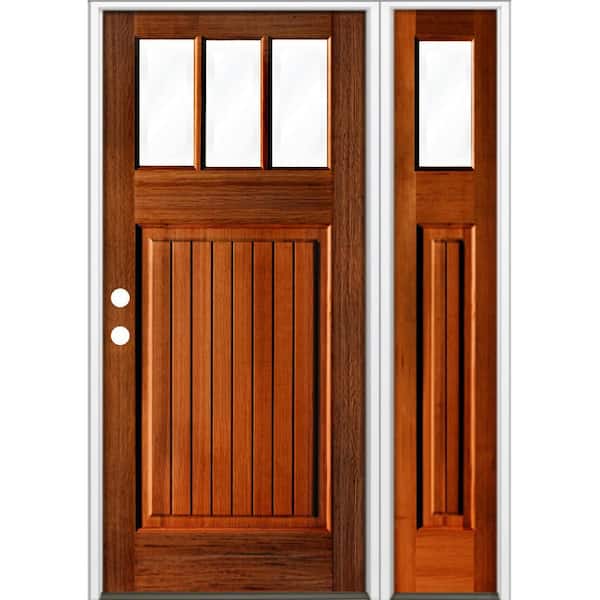 36 in. x 80 in. Craftsman 3-LIte Clear Glass VG Red Chestnut Stain Right Hand Hemlock Wood Prehung Front Door w/RSL