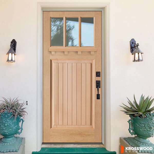 36 in. x 80 in. Craftsman Universal-Handing 3 Lite Clear Glass Unstained Hemlock Wood Front Door Slab with Dentil Shelf
