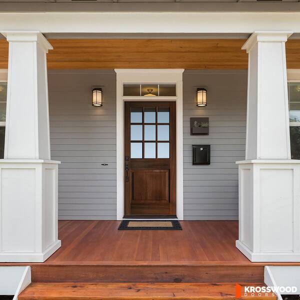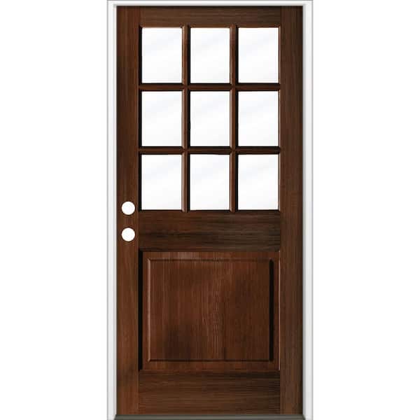 36 in. x 80 in. Farmhouse Beveled 9-Lite Clear Glass Right Hand Red Mahogany Stain Hemlock Wood Prehung Front Door